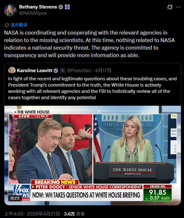 21日,NASA发言人在X平台上发帖表示,正配合调查,“但目前,与NASA相关的任何事情都没有表明存在国家安全威胁。该机构致力于透明度,并将在可能的情况下提供更多信息。”