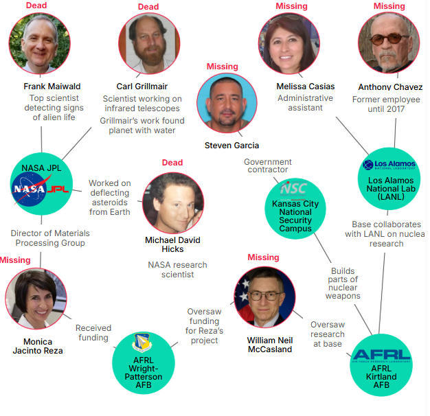 近年来,已有10名与美国军事、核能、航空航天等尖端敏感领域有关的科学家或研究人员,相继离奇失踪或不明死亡。这些案件涉及喷气推进实验室(JPL)、洛斯阿拉莫斯国家实验室、麻省理工学院(MIT)、加州理工学院(Caltech)以及堪萨斯城国家安全园区等机构。